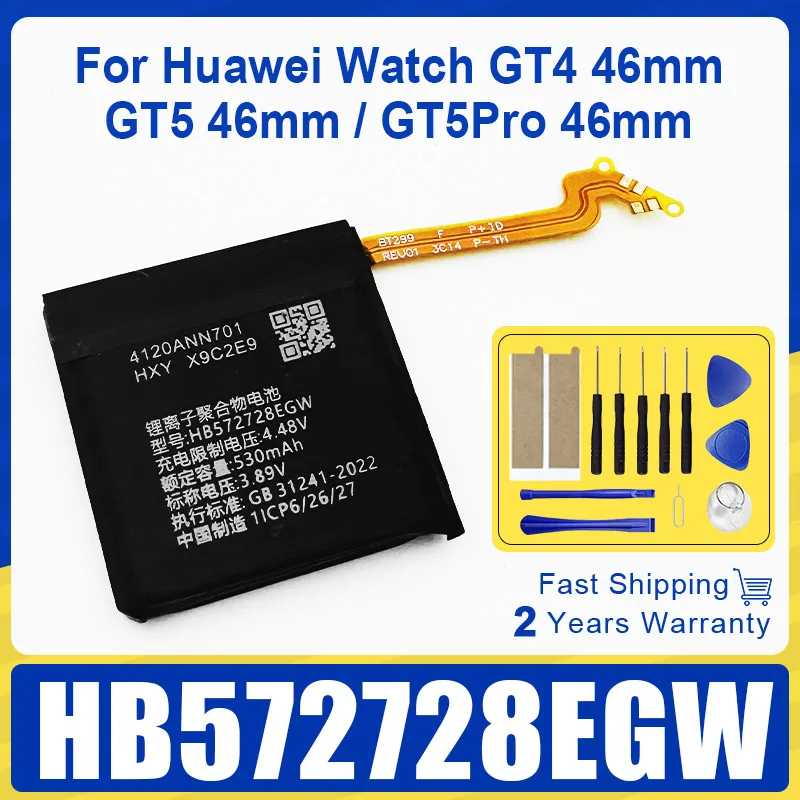 Nowa bateria zamienna typu HB572728EGW o pojemności 530 mAh i napięciu ~3,89 V, kompatybilna z zegarkami Huawei Watch GT4 46 mm (PNX-B19), GT5 46 mm (np. kod PNX-B21) oraz GT5 Pro 46 mm. W zestawie znajdują się podstawowe narzędzia ułatwiające samodzielną wymianę baterii.