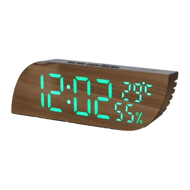 Stylowy drewniany zegar budzik z wyświetlaczem LED, sterowaniem głosowym i wieloma opcjami zasilania. Idealny dodatek do każdego wnętrza.