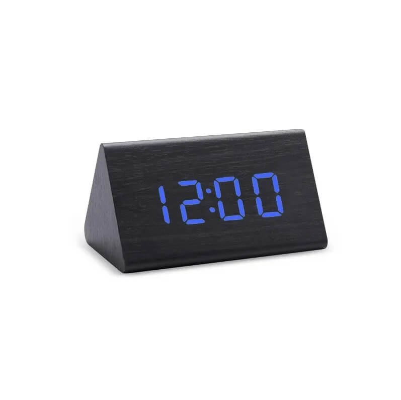 Triobu - Elegancki drewniany zegarek budzik na baterie - cyfrowy - Czarny - niebieski LED